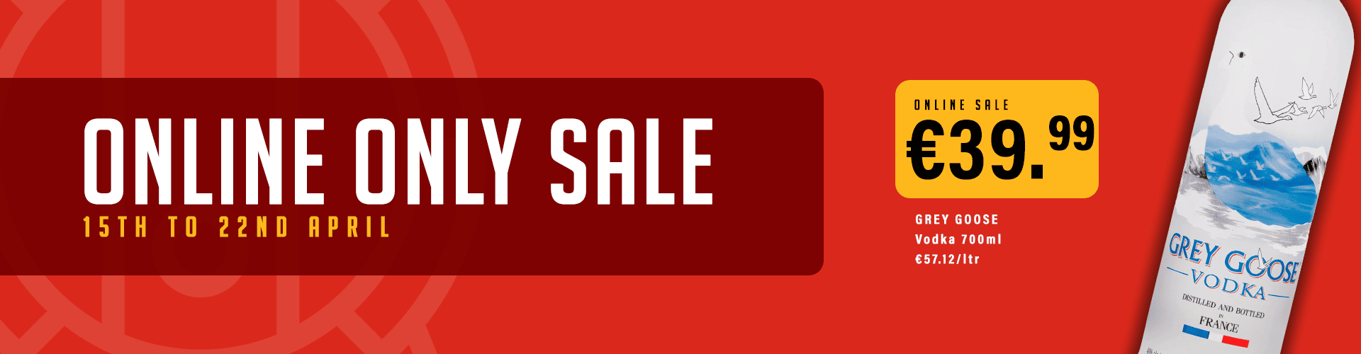 Sale Grey Goose Vodka 700ml Bottle €62.00 €39.99 ONLINE ONLY SALE! VALID FROM 15/04/26 TO 22/04/26 Select Store